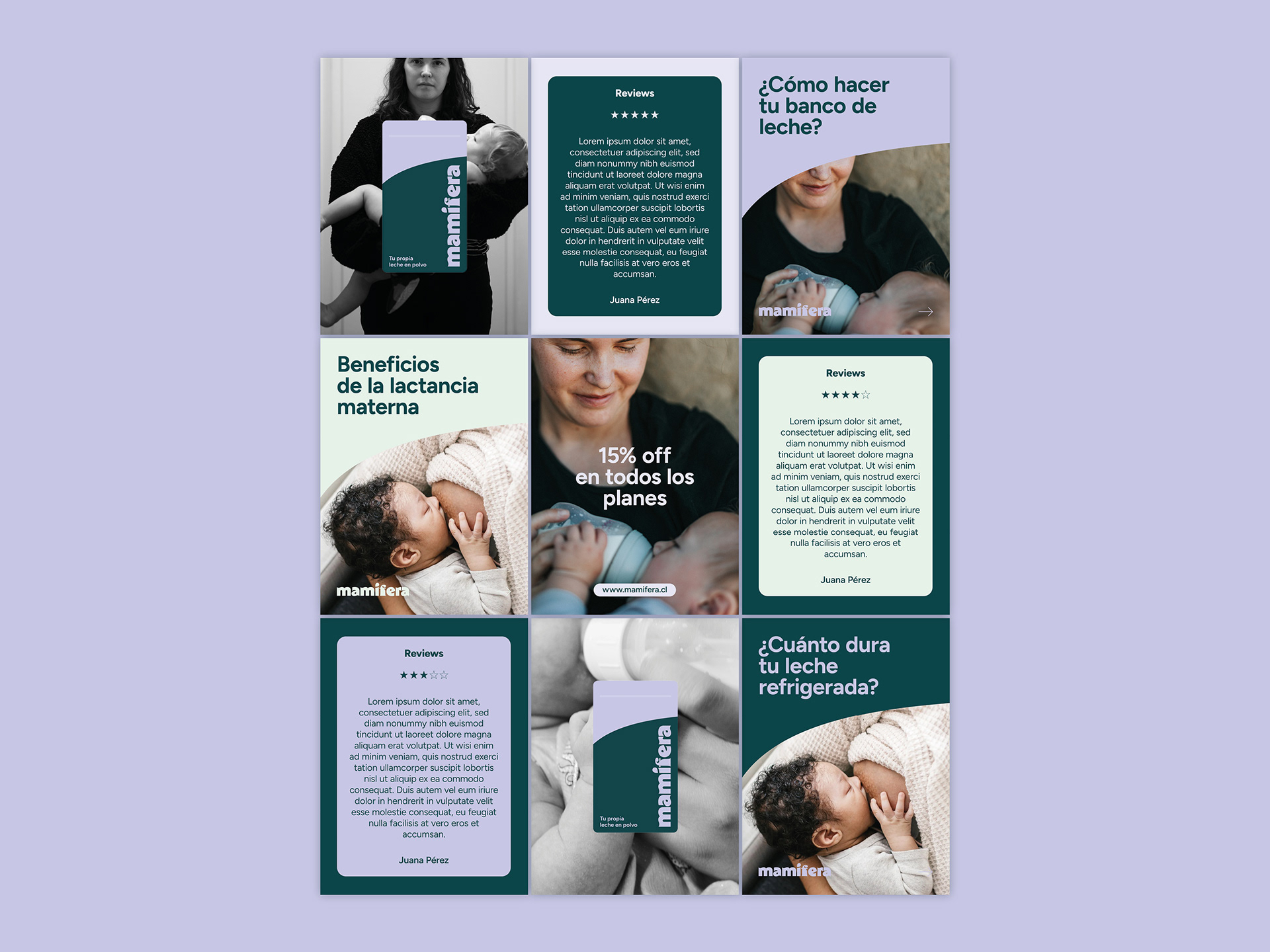 Diseño de identidad para Mamífera, un servicio de liofilización de leche materna, convirtiéndola de líquido a polvo, facilitando la alimentación del bebé en cualquier momento y lugar, ofreciendo la comodidad, conveniencia, practicidad y discreción de la leche de fórmula, pero preservando sus nutrientes y anticuerpos, alargando su durabilidad de 6 meses a 3 años.